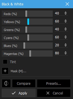 A typical monochrome conversion tool. With this you can adjust you can adjust the lightness or darkness of individual colours to give some dramatic effects. Different programs use different tools, but all do the same basic thing and target colours.