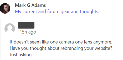 I have never only ever had one camera with just one lens. I have less cameras and lenses now though, than I have had for a long time. Does this mean that I should have a rebrand to reflect this?
