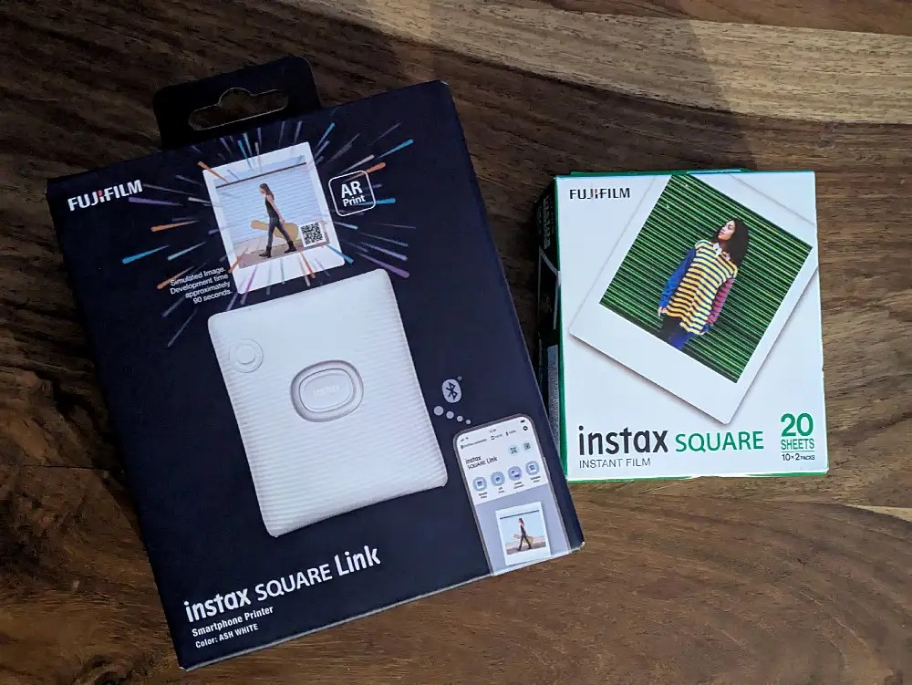 My Instax Square Link printer and a pack of 20 Instax Square film sheets.