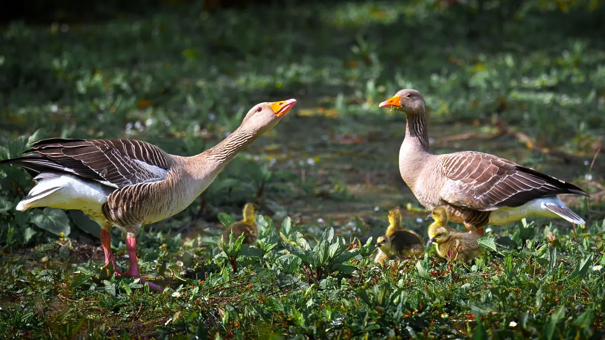 A couple of Greylag Geese fight while the youngsters watch.